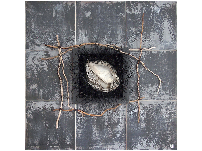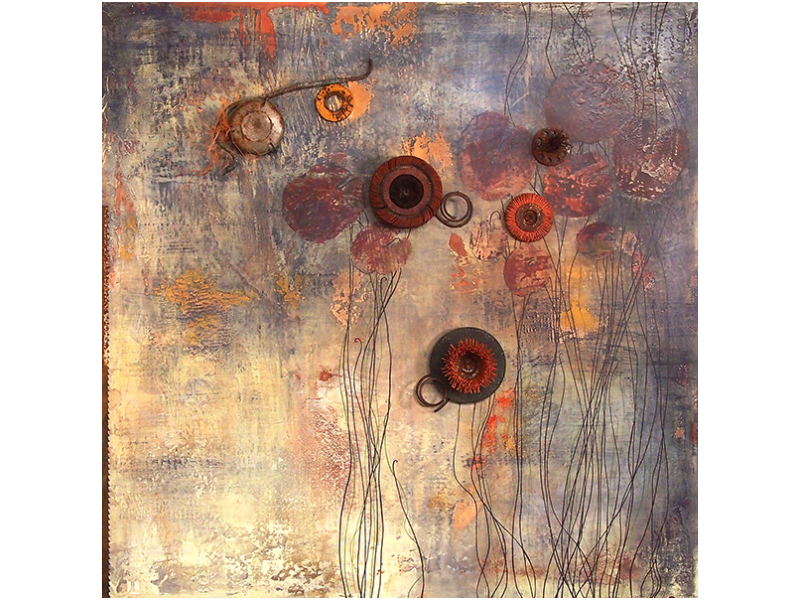 Techniques mixtes et intégration de matières naturelles et industrielles. Ma passion en 4 mots… ramasser, transformer, fusionner et recréer.