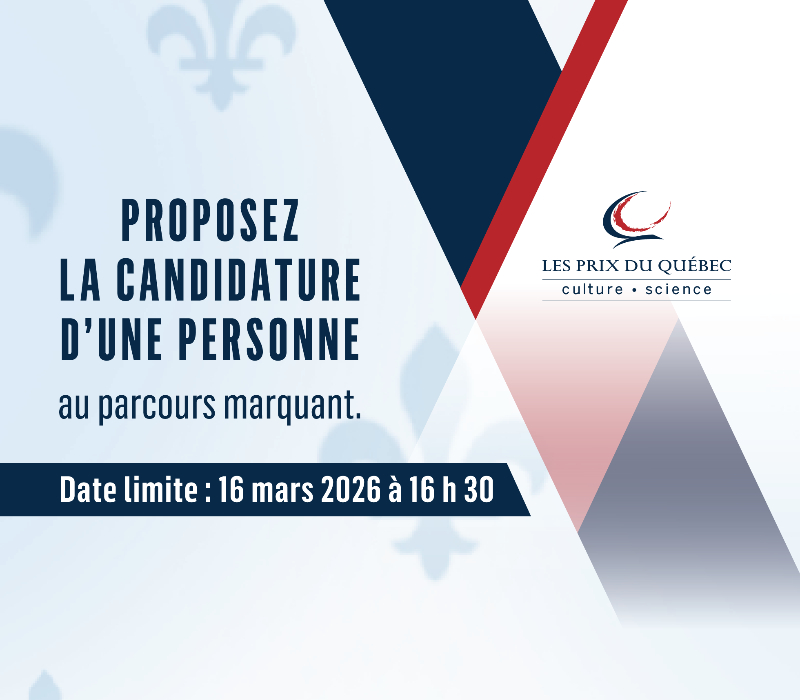 Vous connaissez une personne au parcours marquant en culture ou en science? Apprenez-en plus sur la façon de proposer une candidature ou sur les Prix du Québec en vous rendant au Québec.ca/PrixduQuébec.
