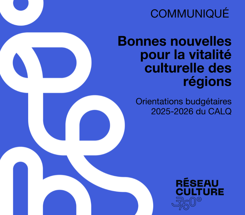 Jeudi 19 juin 2025 – Le Réseau Culture 360°, qui regroupe les 15 conseils régionaux de la culture du Québec dont Culture Mauricie, salue les orientations budgétaires 2025-2026 annoncées hier par le Conseil des arts et des lettres du Québec (CALQ), qui répondent aux recommandations du milieu culturel. Grâce à la bonification de son enveloppe à 200 M$ lors du dernier budget provincial, le CALQ renforce notamment sa présence dans les régions en y augmentant ses investissements.