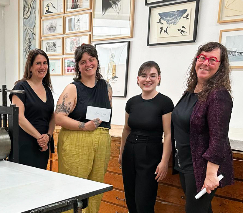 Légende photo : De gauche à droite: Eveline Charland, Marianne Charlebois (Université Concordia) gagnante au volet provincial, Florence Desaulniers (Université du Québec à Trois-Rivières) gagnante au volet UQTR, Fontaine Leriche présidente de l’Atelier Presse Papier. Crédit photo: Élisabeth Mathieu.